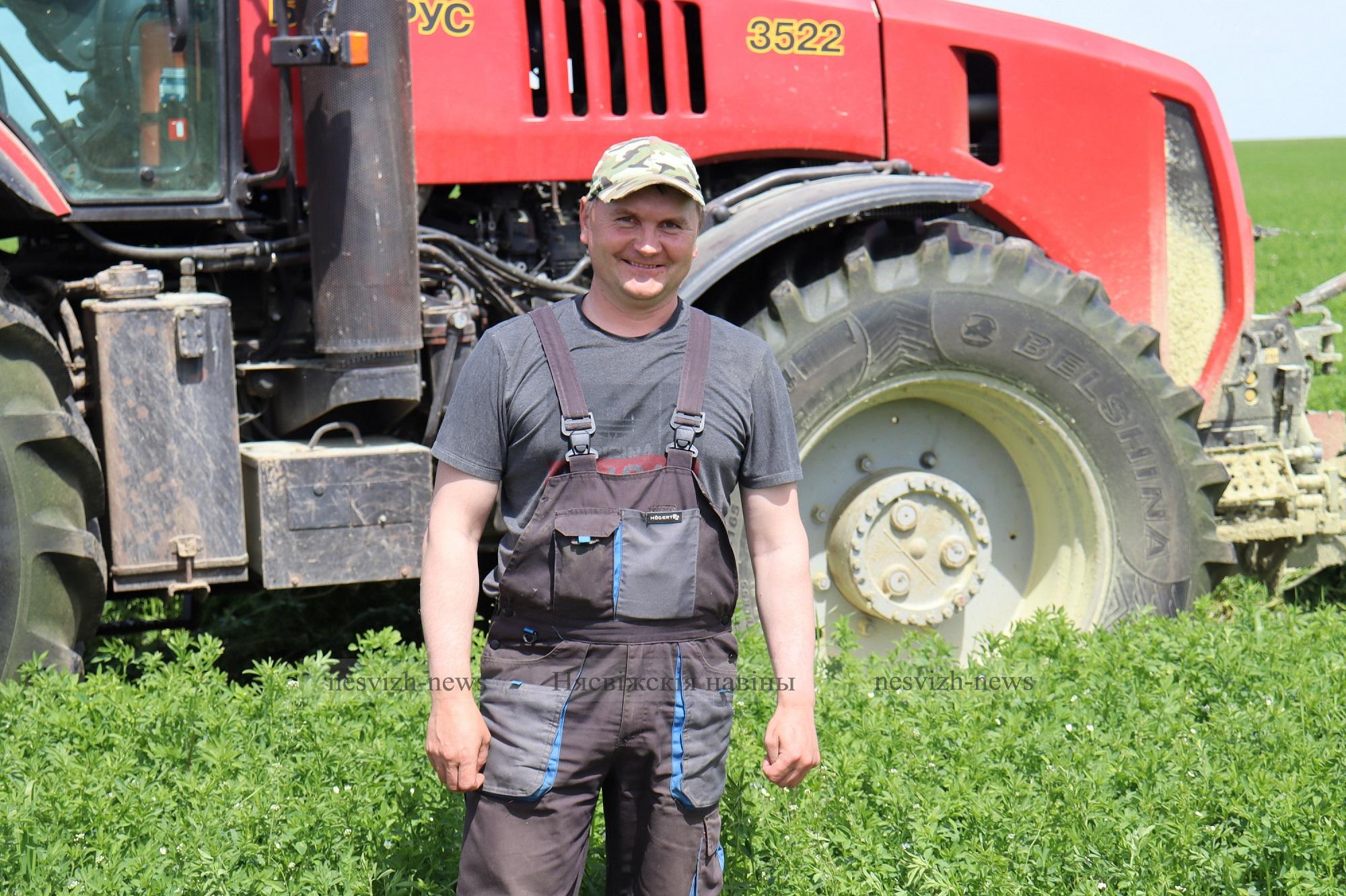 - На «МТЗ-3522» с мощной косой КМР-9 рассекает зеленые волны механизатор Юрий Манулик. Смотря на то, как плавно и быстро идет по зеленому полю энергонасыщенный трактор с мощной косой, понимаешь, насколько точно Юрий Александрович слышит свою технику и насколько она отрегулирована. «Если дать ему волю — больше ста гектаров за день пройти может, — рассказывает директор сельхозпредприятия Василий Холопица. — Технически очень грамотный работник, механизатор от Бога». Конечно, свою роль в плавности работы агрария играет и качество подготовки поля. И по результату видно, что об этом агрономы позаботились очень щепетильно — вовремя посеянное, укатанное, выравненное поле выглядит ровным и на участках уже освобожденных от зеленого покрова