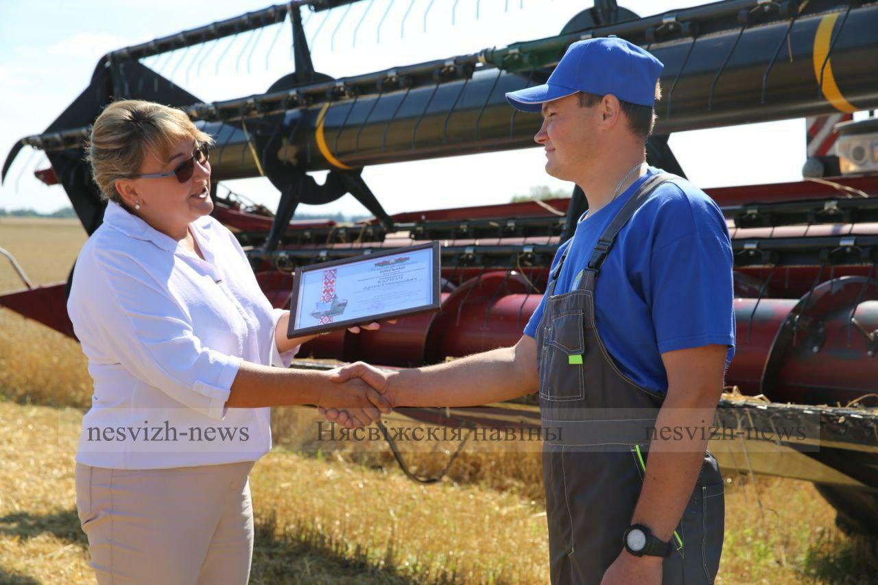 Артем Карпач трудится в ОАО «Лань-Несвиж» инженером по эксплуатации машинно-тракторного парка, а в уборочную страду не только отвечает за выпуск в исправном состоянии всей техники, но и сам садится за штурвал. Это его 4 самостоятельная страда, до этого 6 лет был помощником комбайнера. Поздравить Артема с намолотом первой тысячи приехали в поле заместитель председателя Несвижского райисполкома, начальник управления по сельскому хозяйству и продовольствию Татьяна Жук, председатель райкома профсоюза работников АПК Светлана Антончик и первый секретарь РК ОО «БРСМ» Екатерина Июльская. Татьяна Жук поздравила молодого героя жатвы и вручила ему Благодарственное письмо председателя райисполкома.