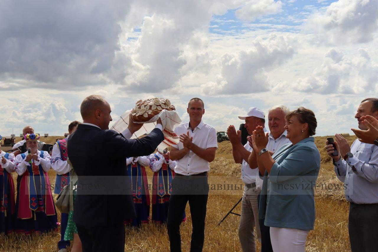 Несвижский район первый в Минской области намолотил 100 тысяч тонн зерна. Сегодня на земле ОАО «Новая жизнь» председателю районного исполнительного комитета Александру Ломскому был вручен символический каравай из муки стотысячного урожая