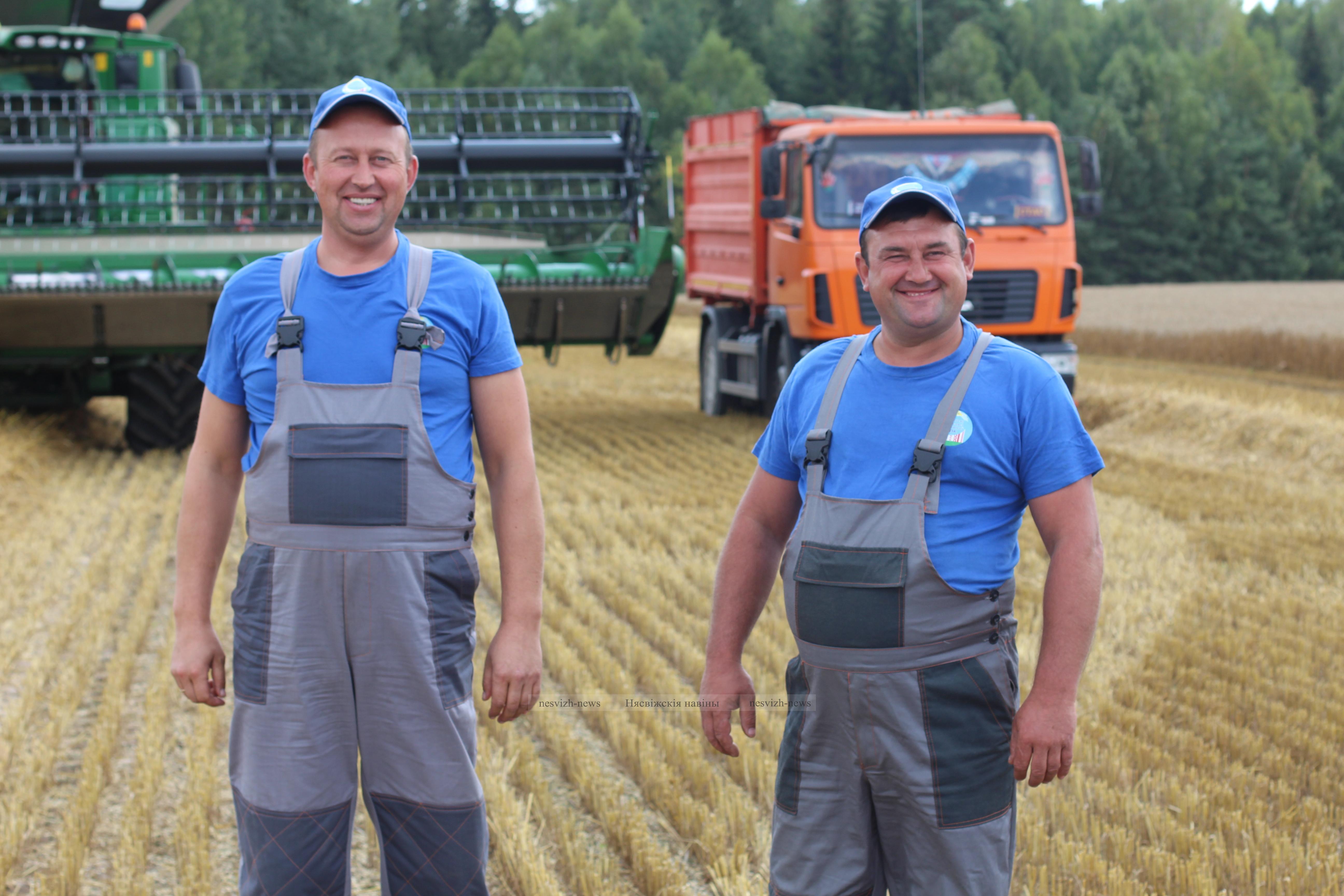 Передовики жатвы — старший комбайнер Сергей Праженик и комбайнер Сергей Авлохов — трудятся в ЗАО «Агрокомбинат Несвижский».