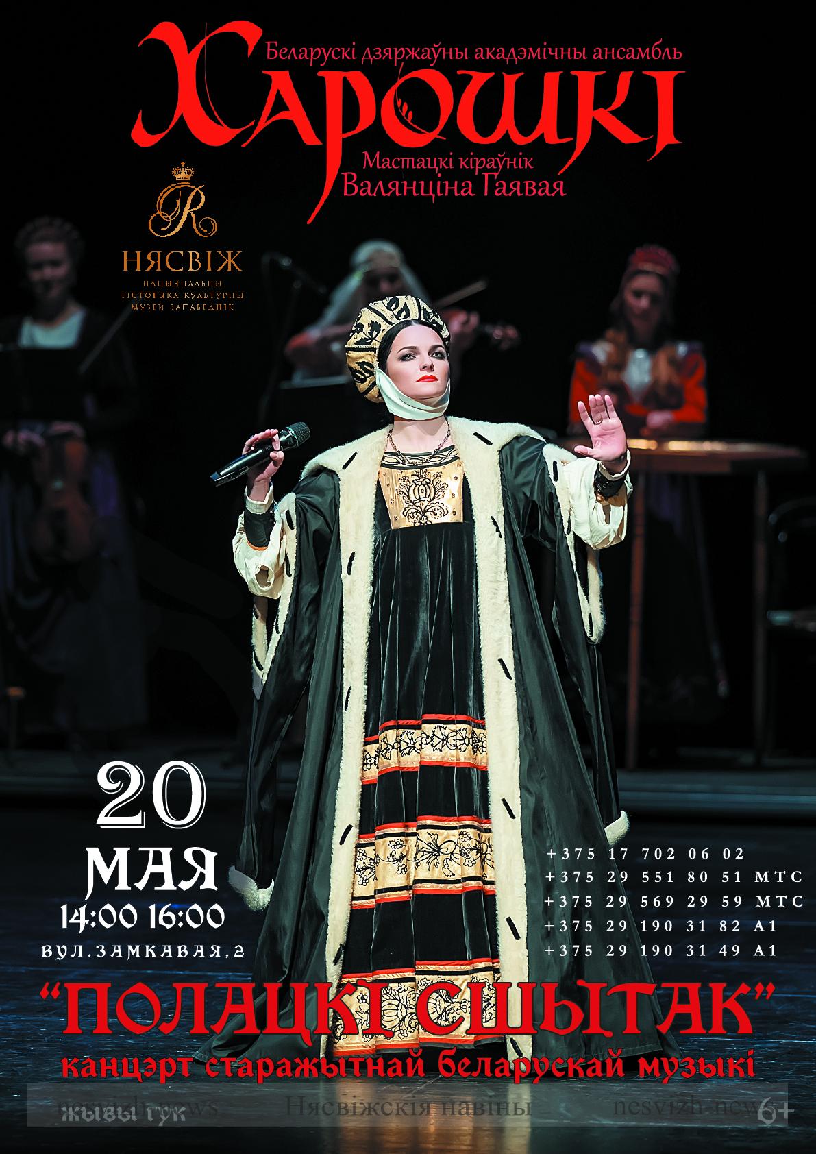 У рамках акцыі «Ноч музеяў» Беларускі дзяржаўны акадэмічны ансамбль «Харошкі» сардэчна запрашае на канцэрты старажытнай беларускай музыкі «Полацкі сшытак», якія адбудуцца 20 мая ў Тэатральнай зале Палацавага ансамбля ў Нясвіжы а 14-ай і а 16-ай гадзінах!