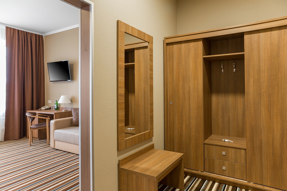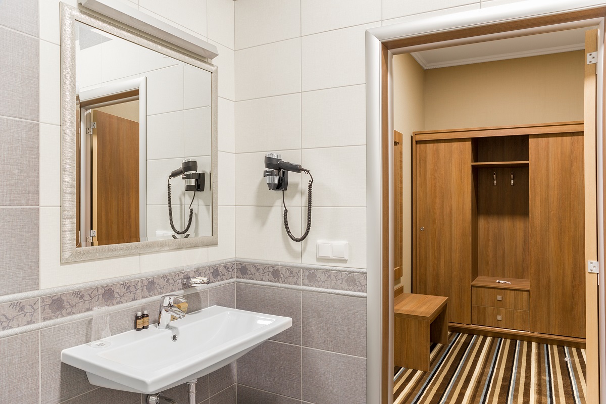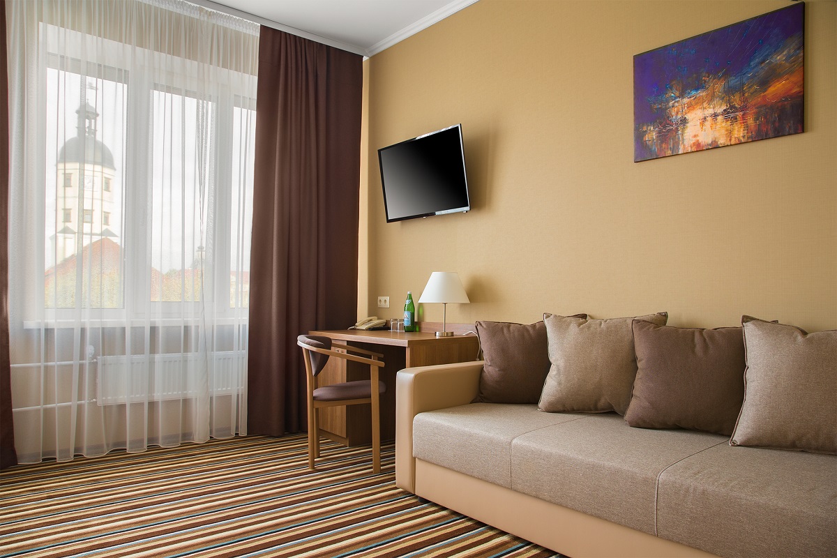 Каждый номер оснащен рабочей зоной и телевизором, — поясняет Полина Сергеевна. — В номерах стандартной и повышенной категорий (за исключением одноместных номеров), в комнатах есть дополнительная мягкая мебель в виде диванов, в прихожей — шкаф, чтобы разгрузить чемодан, в ванной комнате — душевая кабинка, туалет. Иногда гости спрашивают: что нужно брать с собой? Так вот — ничего. Ведь полотенца, фен, гель для душа и шампунь есть в каждом номере.