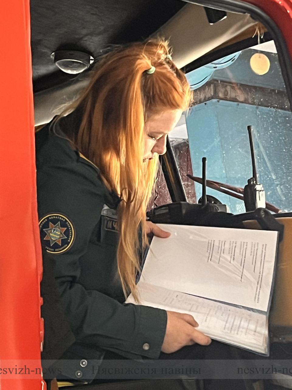 В составе заступающей смены я отправляюсь на проверку пожарно-технического вооружения. Для каждого отсека пожарной машины свой перечень ПТВ. Например, на крыше расположились различные рукава, стволы и лестницы. Я занялась проверкой насосного отсека. В перечне 8 позиций — 11 устройств. Здесь всё аккуратно укомплектовано, но всё-таки мне сложно различать устройства. Обращаюсь за помощью к мастеру-спасателю Егору Радюку. Теперь я знаю разницу между гидроэлеватором и водосборником. И вот, когда все машины, отсеки проверены, баллоны наполнены, караулы полностью сменились. Начинается время подготовки к занятиям. От водителя Николая Зазулинского узнаю, что сегодня сдаются нормативы боевого развертывания под номером 3 и 10. Иду к начальнику дежурной смены Игорю Алексеевичу Лукашанцу. Он показывает папку с нормативами. Оказывается, что норматив №3 — боевое развертывание с подачей через разветвление перекрывного ствола, а №10 — боевое развертывание с подачей ПЛС и подачей через развертывание звеном ГДЗС перекрывного ствола. Названия не стали более понятными, но благодаря прилагаемым схемам ситуация проясняется. Плюс занятие по оказанию помощи пострадавшим, обрезке электропроводов и ликвидации ДТП. Пока я разузнавала, все подготовились и отправились на занятия. В это время я пойду нести службу дневального на КПП. Всего есть три вида дневальства: по КПП, по гаражу и ночное дневальство с 23.00 до 7.10. В нем за смену успевает поучаствовать весь личный состав на всех позициях, так как пересменка примерно каждый час. И вот я заступаю, предварительно получив инструктаж от мастера-спасателя Егора Радюка. Мне нужно поддерживать чистоту и порядок перед фасадом здания и на КПП, не допускать остановки и стоянки транспортных средств перед выездными воротами, осуществлять допуск посторонних лиц в служебные помещения и на территорию подразделения только в сопровождении дежурного по смене или по распоряжению руководства подразделения, по прибытии должностных лиц гарнизона — представиться и вызвать начальника дежурной смены, а по прибытии других лиц — представиться, уточнить цель прибытия и вызвать начальника дежурной смены. Кажется, что ничего сложного. Во время дежурства скачала себе на смартфон приложение «Справочник спасателя» и поглубже изучила обязанности личного состава, почитала устав. Занятия длятся с 9.00 до 13.00, поэтому я успела еще подневальствовать по гаражу.