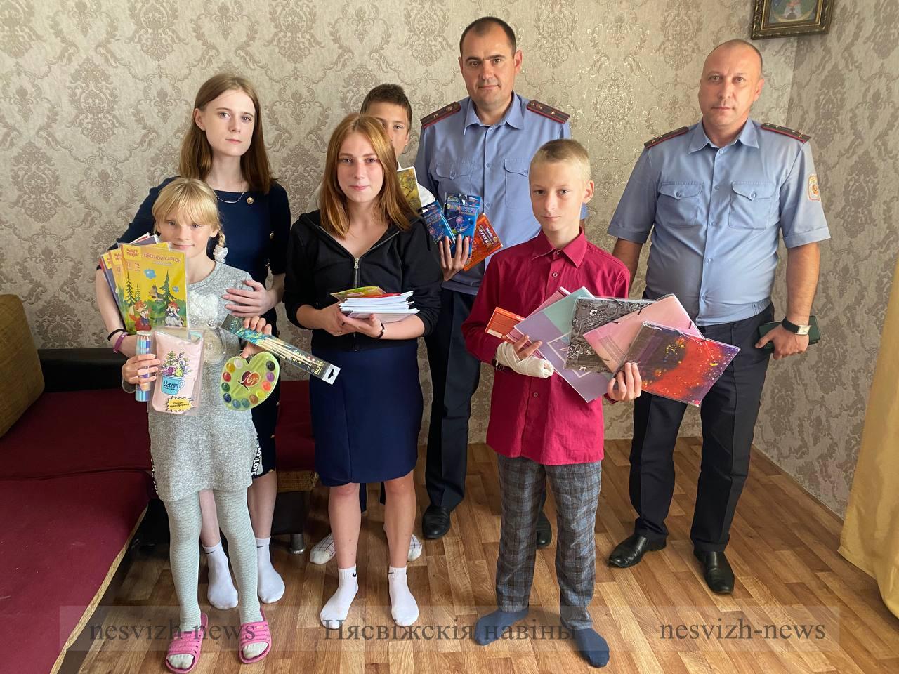 В преддверии нового учебного года сотрудники Несвижского районного отдела внутренних дел присоединились к благотворительной акции «Помоги пойти учиться», которая проводится в рамках Республиканской межведомственной программы «Забота». Заместитель начальника РОВД начальник милиции общественной безопасности Олег Клочко и старший инспектор ИДН Дмитрий Богушевич посетили семью Ракитиных. Здесь воспитываются пятеро деток — двое мальчишек и трое девочек. Сотрудники отдела вручили ребятам канцелярские товары и другие школьные принадлежности, которые, безусловно, пригодятся для учебы, а также пожелали учащимся успехов в предстоящем учебном сезоне.