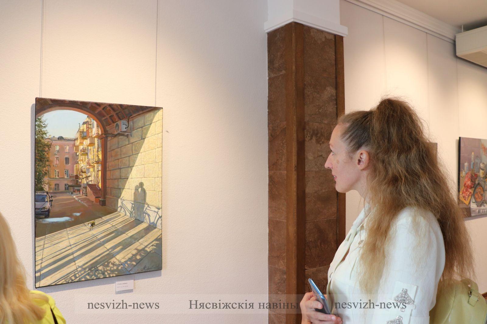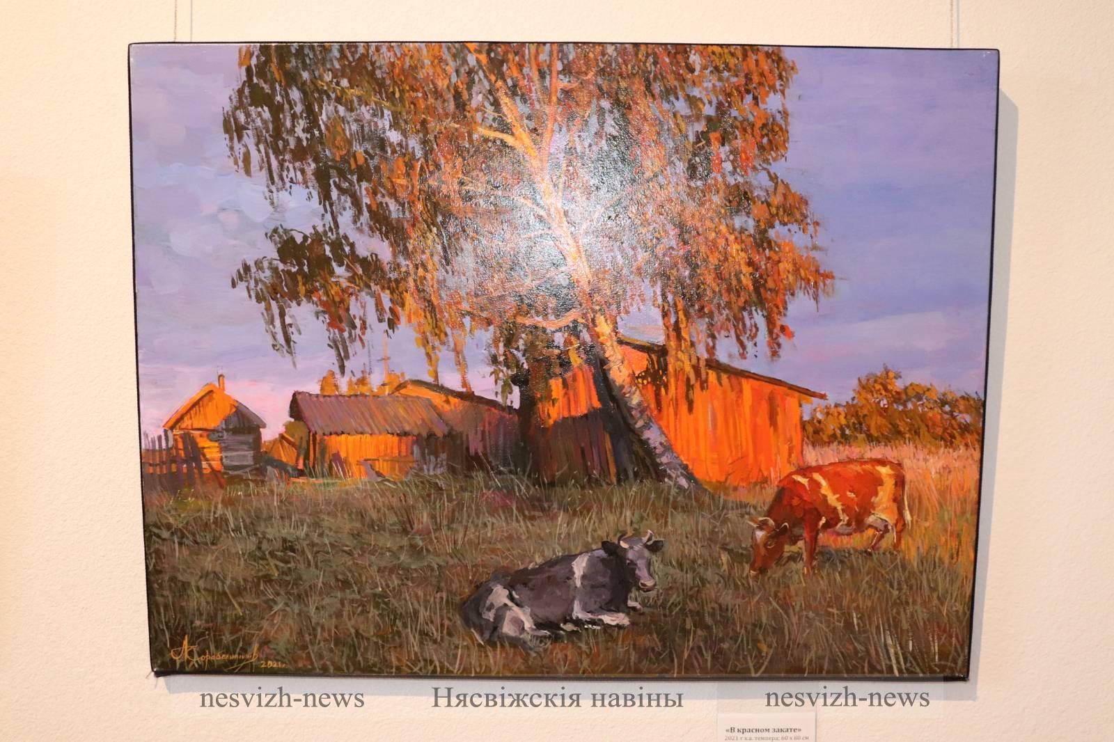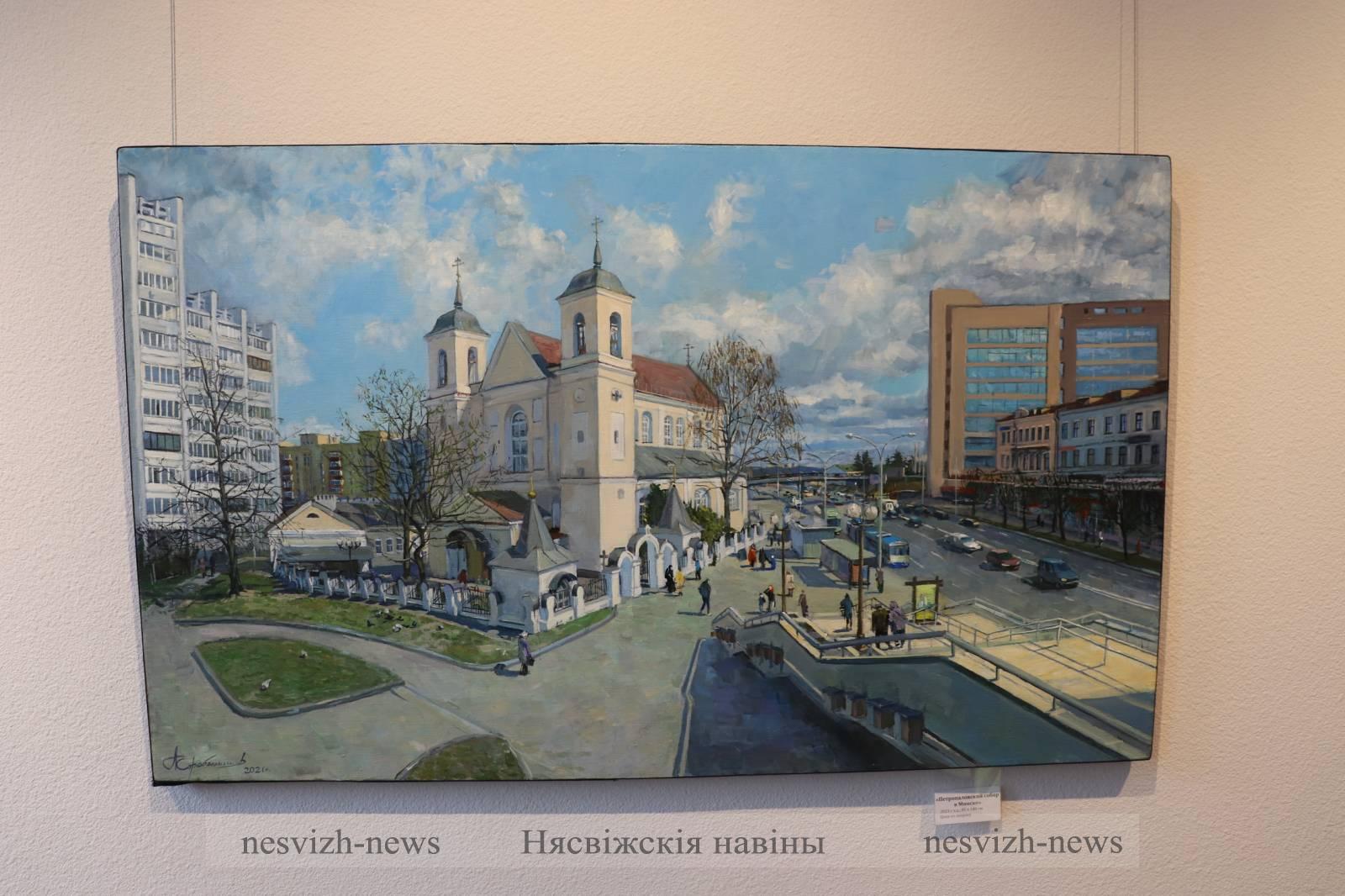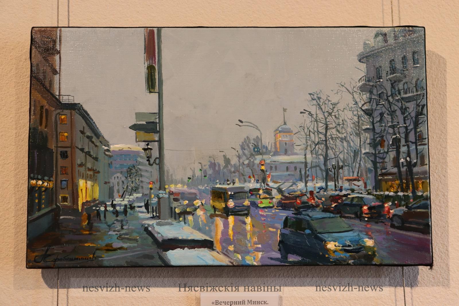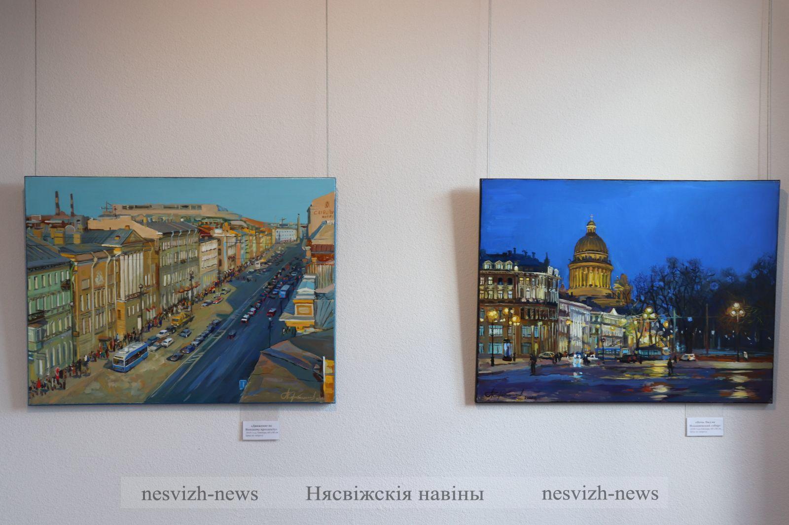 Ёсць на выставе і вясковыя пейзажы, і выявы Мінска і Санкт-Пецярбурга, пададзеныя праз прызму ўспрымання мастака.