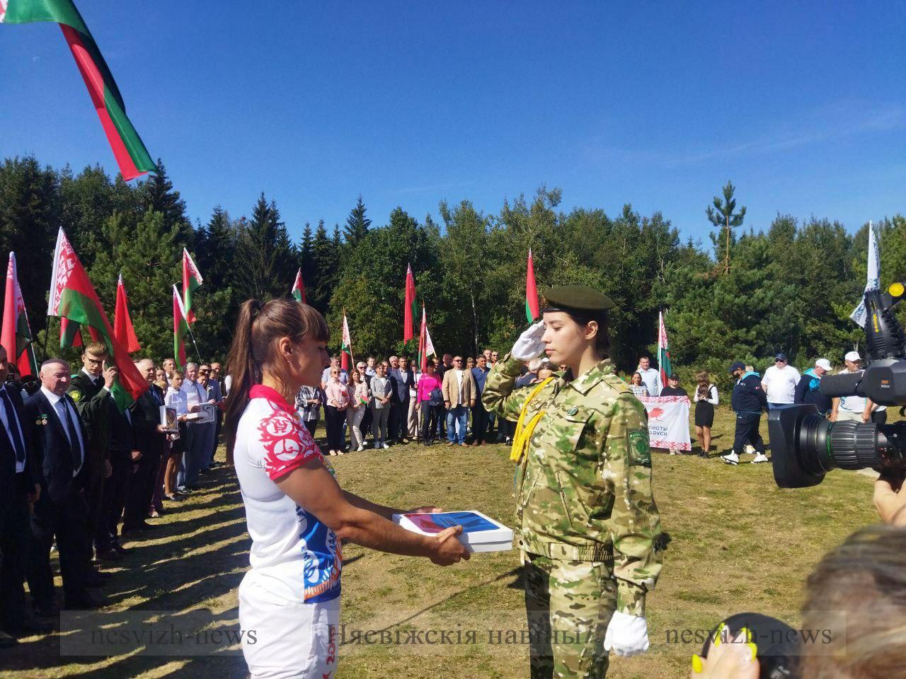 Сегодня был дан старт акции – на горе Дзержинской состоялась церемония передачи флагов районов. В мероприятии приняли участие представители Несвижчины – начальник отдела идеологической работы, культуры и по делам молодежи райисполкома Людмила Витко и учитель физической культуры Несвижской гимназии Татьяна Терпицкая.