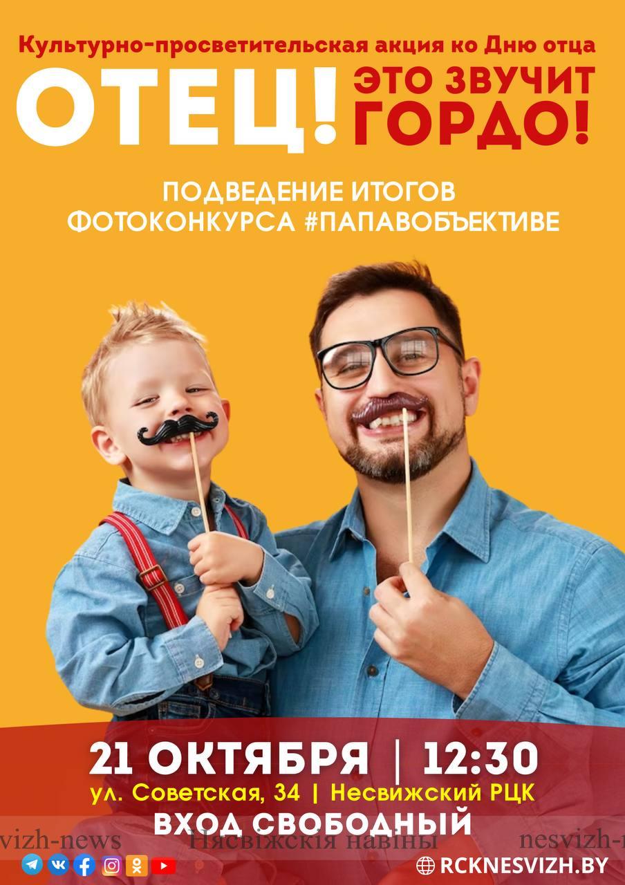 Уважаемые жители и гости города Несвижа, приглашаем вас на культурно-просветительскую акцию, посвященную Дню отца, которая состоится 21 октября в Несвижском РЦК!
