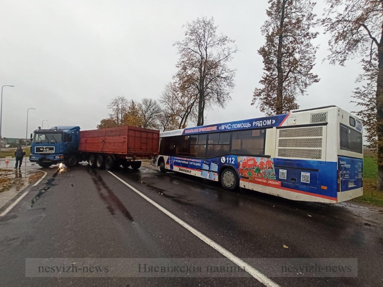 21 октября около 8:50, 33- летний житель г.Несвиж, управляя автомашиной «MAN», в составе с полуприцепом «KRONE», двигаясь из г. Клецка в направлении г. Несвижа на 6 километре автодороги Р-12 «Несвиж-Клецк», вблизи АЗС «Татнефть», уходя от столкновения со стоящим в полосе движения автомобилем «Мазда» , осуществляющим поворот налево , ушел в неуправляемый занос, при этом выехал на полосу встречного движения, где столкнулся с движущемся на встречу автомобилем «Тойота», под управлением 37-летнего местного жителя. От столкновения автомобиль «Тойота» съехал в правый по ходу движения кювет, на пассажирском заднем сидении которого находился 13-летний пассажир . После чего автомобиль «MAN», совершил наезд на стоящий автомобиль «Мазда», и далее столкнулся с автобусом «МАЗ», стоящим на обочине. В результате ДТП, несовершеннолетний пассажир был доставлен в больницу, после оказания медицинской помощи отпущен домой. Мальчик был пристегнут ремнем безопасности, благодаря чему удалось избежать серьёзных последствий.