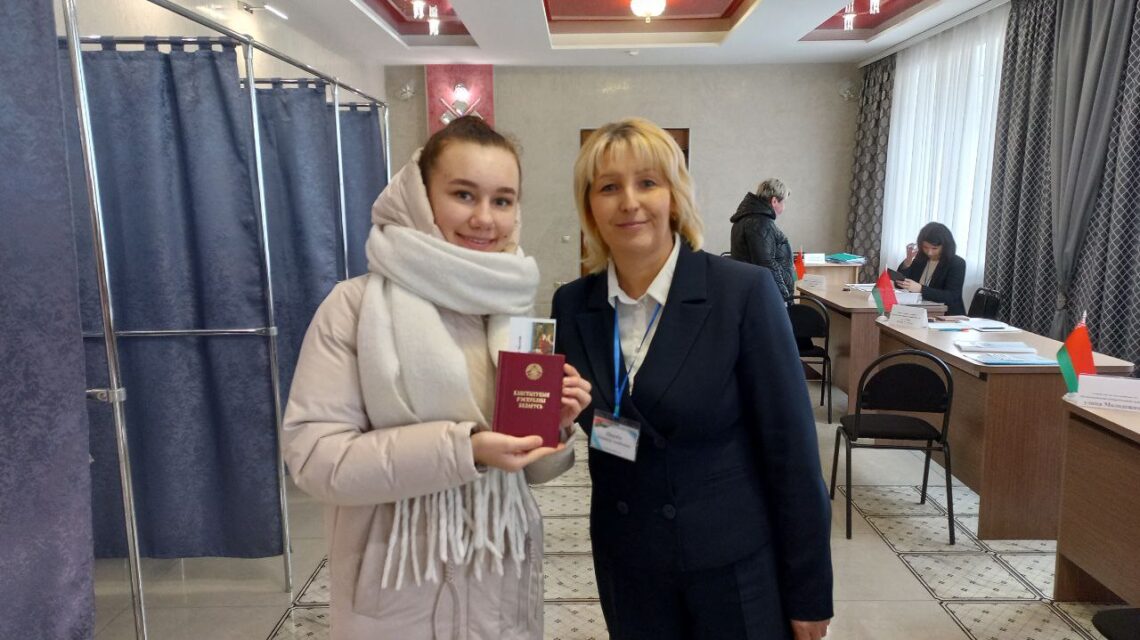 На память о первом в жизни голосовании из рук секретаря комиссии Людмилы Шкраба Яна Дорофей получила в подарок Конституцию Республики Беларусь и два билета на посещение Несвижского замка.