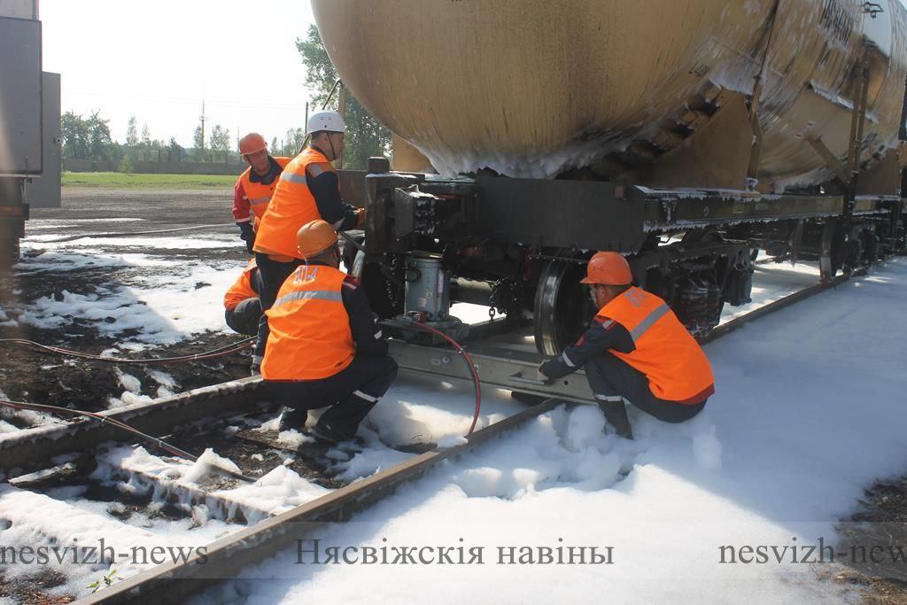 Следующая имитированная ситуация — столкновение грузового и пассажирского поездов, в результате происшествия сошел с рельс один железнодорожный вагон, входящий в состав, состоящий из товарных вагонов и цистерн. Цистерна с топливом разгерметизировалась. В ходе реагирования на данную ситуацию были отработаны мероприятия по оповещению и эвакуации населения, находящегося в зоне опасности, оказанию первой медицинской помощи пострадавшим, ликвидации загорания цистерны, организация перекачки топлива в другую цистерну, привлечение к оперативным действиям пожарного поезда, транспортировке неповрежденных вагонов и цистерн с выходом на обгонный путь.
