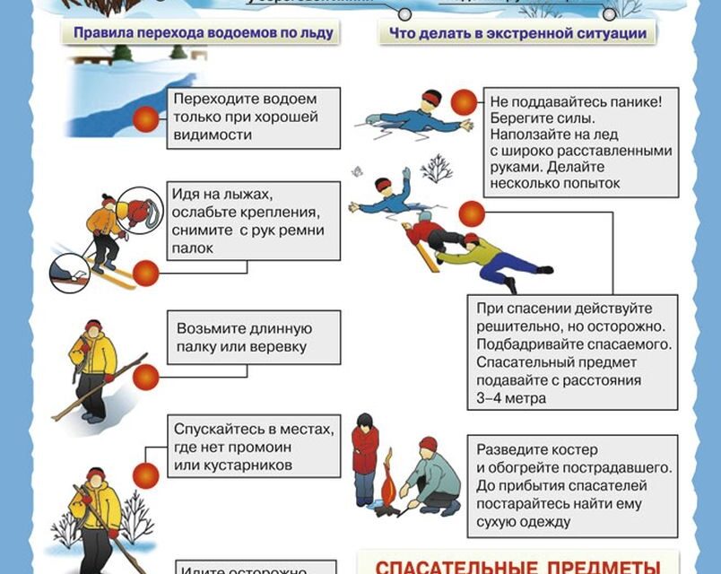 Прежде чем выйти на лед, убедитесь в его прочности, используйте нахоженные тропы по льду. При их отсутствии, стоя на берегу, наметьте маршрут движения, возьмите с собой крепкую длинную палку, обходите подозрительные места. В случае появления типичных признаков непрочности льда: треск, прогибание, вода на поверхности льда — немедленно вернитесь на берег. Идите широко расставленными ногами, не отрывая их от поверхности льда, в крайнем случае — ползите. Никогда не проверяйте прочность льда ударом ноги.
