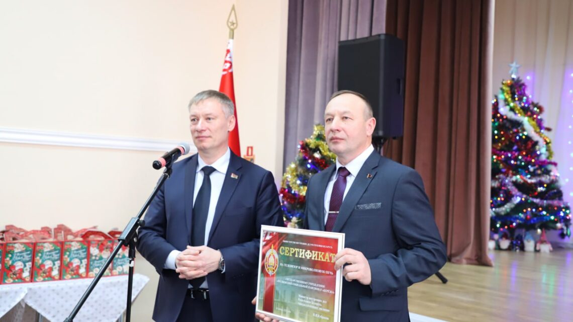 Пасля гэтых добрых слоў Дзмітрый Карзюк уручыў установе ў асобе яго дырэктара Віктара Лябедзькі сертыфікат на каляровы тэлевізар і мікрахвалевую печ, якія зробяць знахо- джанне тых, хто пражывае ў пансіянаце, яшчэ больш камфортным. Акрамя гэтага, пастаяльцы “Бярозкі” атрымалі ад гасцей яшчэ і салодкія падарункі.