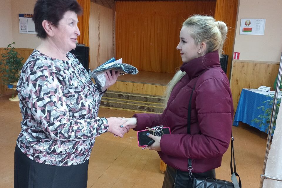 На память о первом в жизни голосовании Светлана Юнкевич получила подарок от председателя комиссии Светланы Веремейчик.