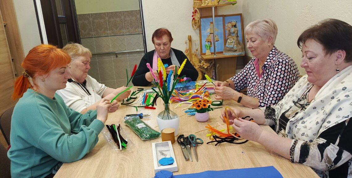 — Тем, кто любит творить своими руками, предлагаю разнообразные направления декоративно-прикладного творчества: вязание, шитье, вышивку, бисероплетение, — рассказывает руководитель кружков Анна Михайлик. — В салоне-галерее «Скарбніца» выставлялись работы наших посетителей — картины, вышитые крестиком. А вообще, наши пожилые легки на подъем, рады открывать для себя что-то новое. Например, недавно осваивали премудрости мыловарения, которое сейчас популярно. Оно замечательно позволяет воплотить задумки для подарков, всё получается эстетично и красиво. Также с удовольствием делали фигурки из гипса, создавали украшения и цветы из фоамирана — пластичной искусственной замши. Букет цветов из такого материала не выцветает, будет долго стоять и радовать глаз. Мы изучаем разные техники, ищем в Интернете модели, нередко привносим в них что-то новое. Когда, работая над поделками, реализуешь собственные идеи — это помогает поверить в свои силы, справиться с плохим настроением. И если наши посетители хотят заняться чем-то новым, рада сама научиться и научить их этому, — отметила Анна Александровна.