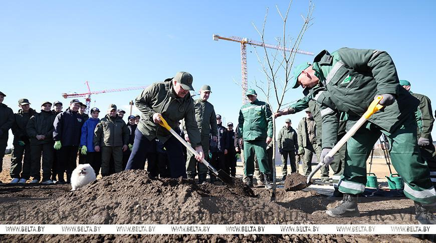 Первое дерево на месте парка Народного единства посадил лично Президент. А заодно провел мастер-класс по посадке деревьев. Александр Лукашенко заметил, что люди, которые работают вместе с ним, умеют делать все: сажать деревья, косить траву, рубить дрова.