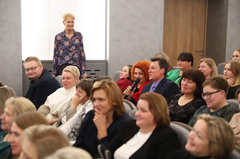 Праздничную атмосферу в зале создавали хорошо продуманные видеоряды, а также музыкальные номера в исполнении самих педагогов — Эллы Чанкиной, Владимира Парейко и Евгении Гайдук.