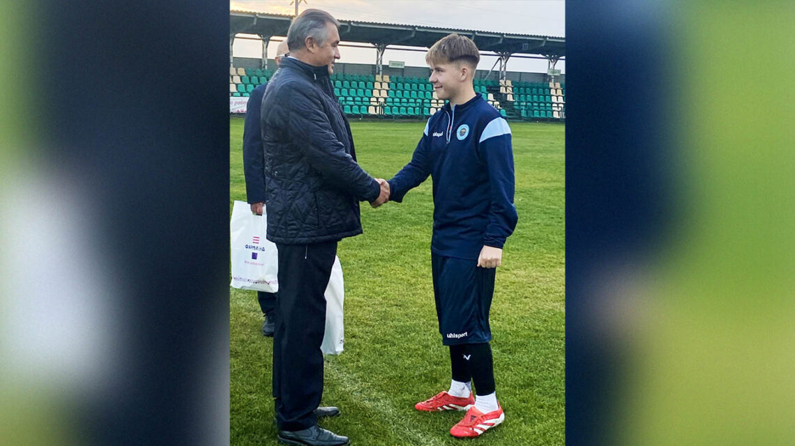 На фото: по итогам матча «ГСК Городея U-17» — «Молодечно-2018 U-17» Председатель Совета директоров СП ООО «Фармлэнд» Иван Логовой и Генеральный директор предприятия Иван Ильин вручили лучшим игрокам обеих команд и судейской бригаде памятные подарки.