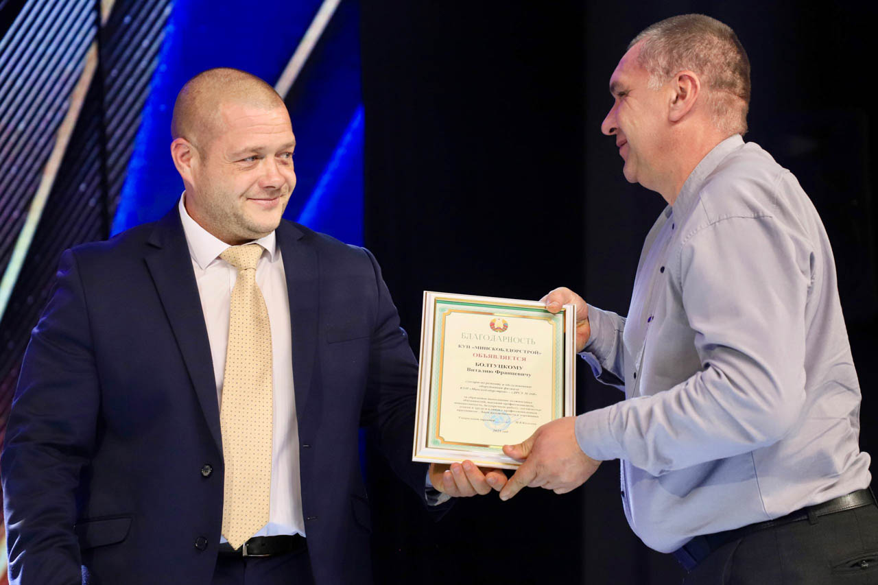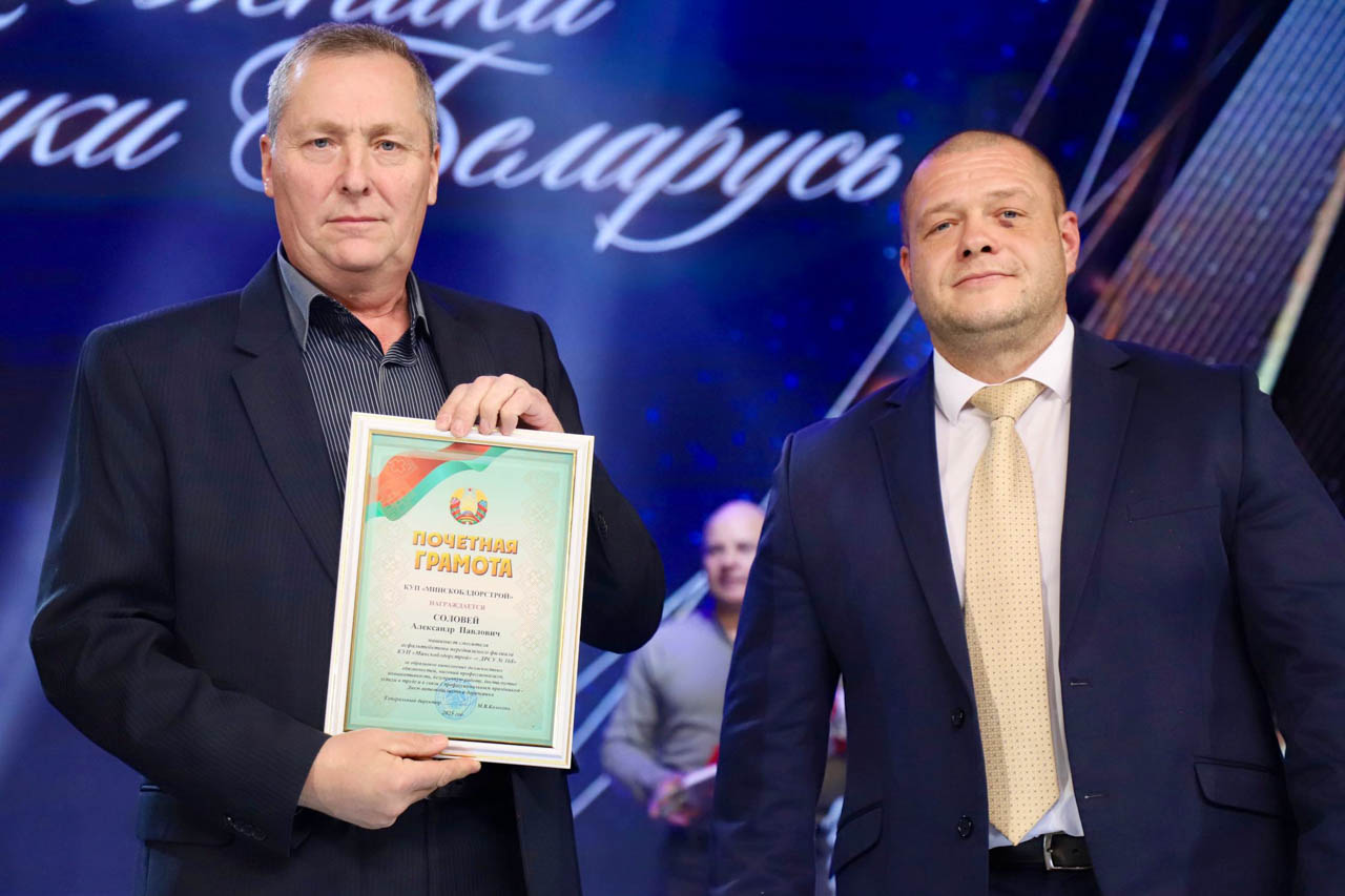 Генеральный директор КУП «Минскоблдорстрой» Максим Колесеня, заместитель председателя Минского облисполкома Виктор Рагусский поздравили коллег с наступающим праздником и вручили заслуженные награды.