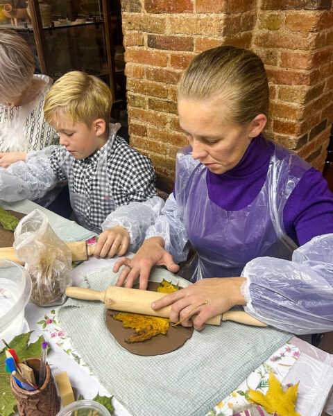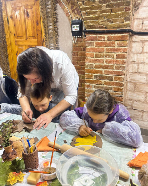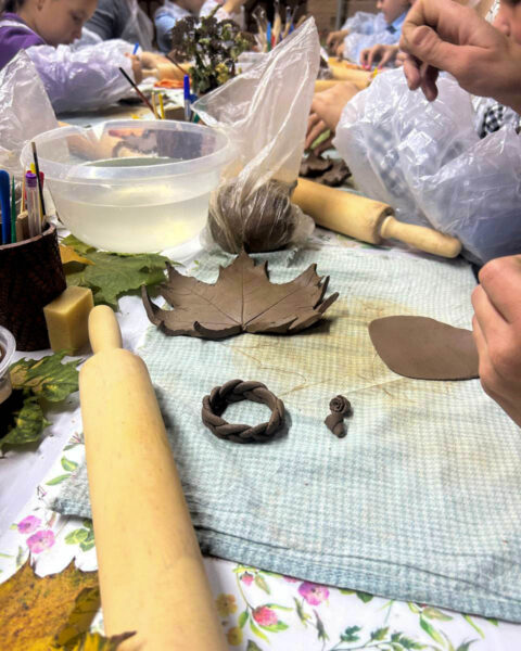 На мастер-классе ребята и мамы собственными руками лепили изделия для домашнего декора — подсвечники в виде кленовых листочков или декоративные тарелочки в осенней стилистике.