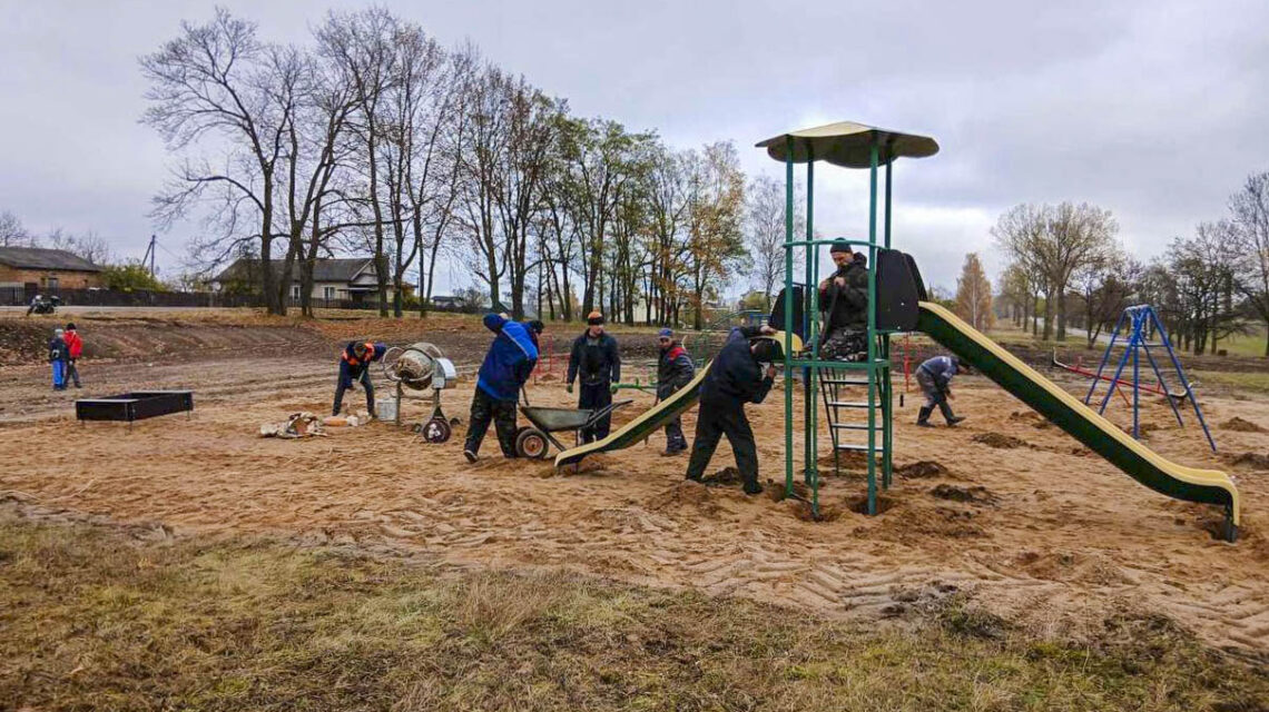 Жители деревни Леоновичи трудились семьями: собирали игровые элементы, устанавливали их, наводили порядок на прилегающей территории.
