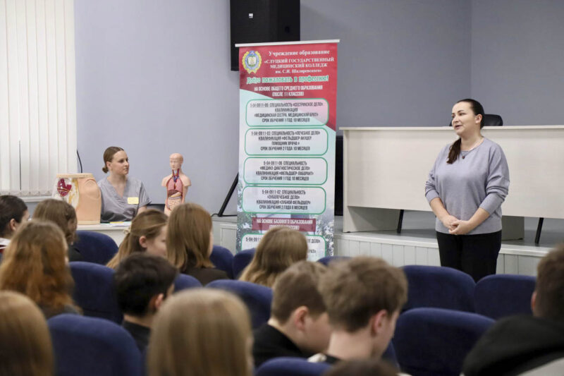 С приветственным словом и подробной информацией о специальностях, учебном процессе и условиях поступления к собравшимся обратилась культорганизатор Слуцкого медколледжа Алеся Курильчик. Она рассказала о преимуществах обучения в колледже, о востребованности медицинских специалистов на рынке труда. Особое внимание было уделено каждой специальности. Алеся Викторовна особо подчеркнула в своем выступлении, что Слуцкий медколледж — это надежный старт для всех, кто мечтает связать свою дальнейшую жизнь с медициной.