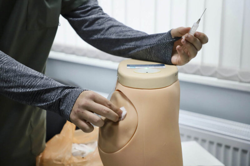 Ребята с удовольствием приняли участие в небольшом обучении, где каждый желающий смог попробовать сделать внутримышечную инъекцию на фантоме ягодиц с электронным контролером.