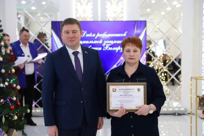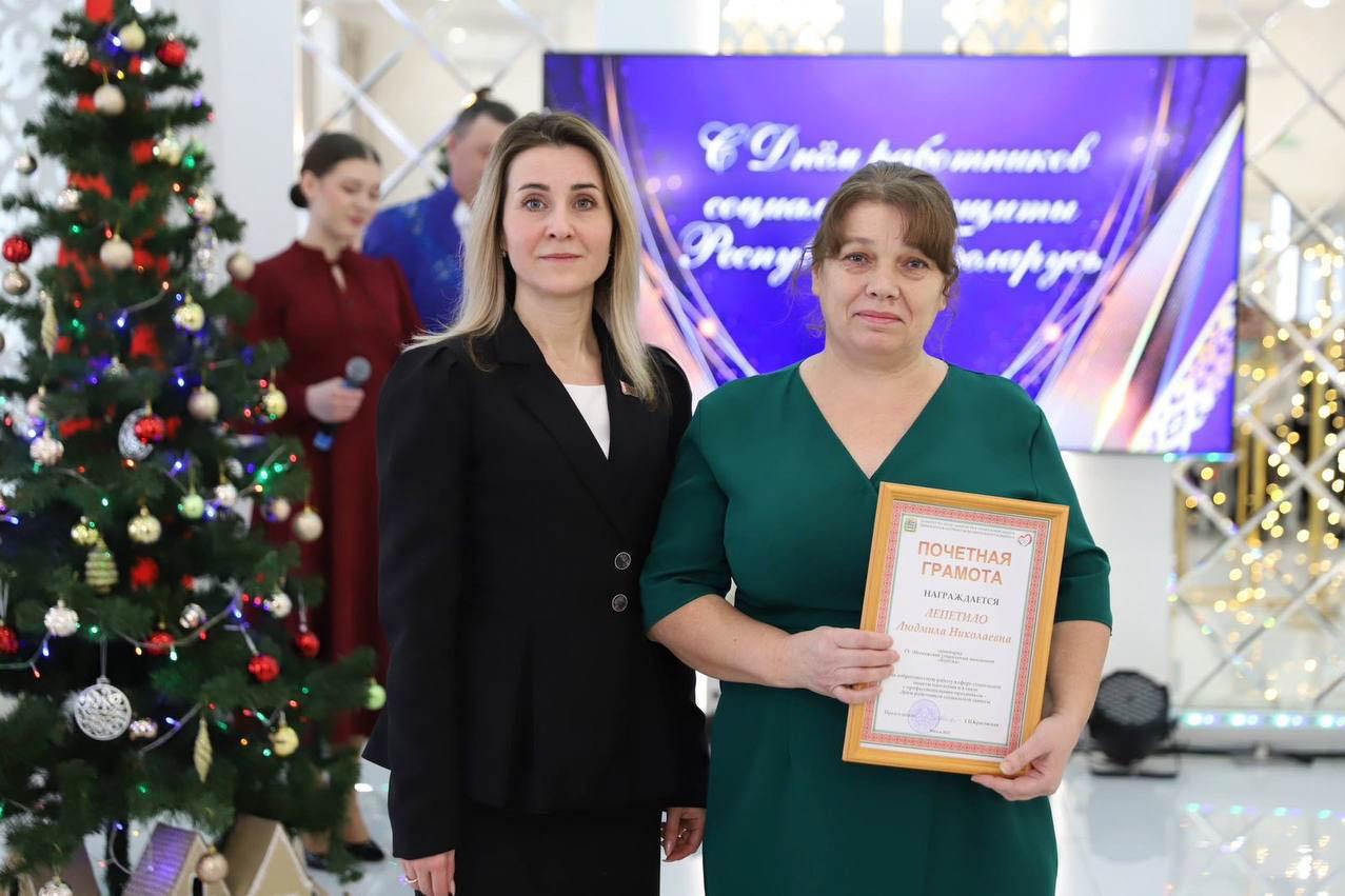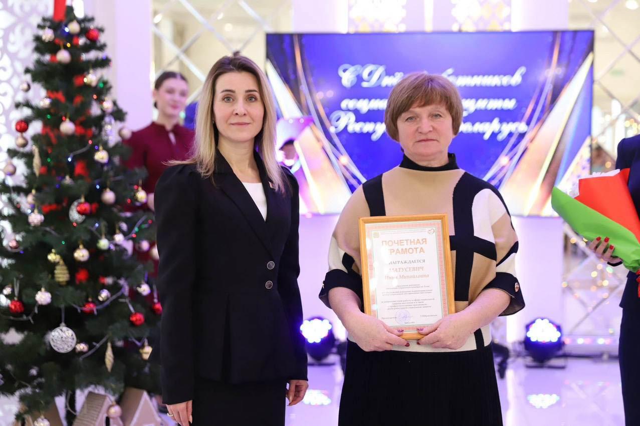 Анастасия Бутор вручила Грамоты комитета по труду, занятости и социальной защите Миноблисполкома социальному работнику отделения социальной помощи на дому государственного учреждения «Несвижский районный территориальный центр социального обслуживания населения» Инне Матусевич и санитарке государственного учреждения «Несвижский социальный пансионат «Берёзка» Людмиле Лепетило. Также Анастасия Степановна объявила Благодарность председателя комитета по труду, занятости и социальной защите Минского областного исполнительного комитета заведующему отделением обеспечения круглосуточного пребывания для граждан пожилого возраста и инвалидов государственного учреждения «Несвижский районный территориальный центр социального обслуживания населения» Светлане Веремейчик, водителю автомобиля государственного учреждения «Несвижский районный территориальный центр социального обслуживания населения» Виктору Рачку и водителю автомобиля государственного учреждения «Несвижский социальный пансионат «Берёзка» Дмитрию Ванагелю.