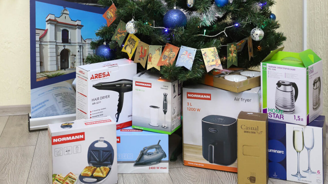 Соусницы выиграл П.А. Логинов, набор бокалов отправится С.Н. Мацкевич, набор чашек достался Н.Н. Усович, фен — И.В. Безушко, блендер порадует Т.К. Судник, чайник — А.С. Дятлович, сэндвичница отправится Я.И. Судник, утюг — Т.Н. Панкевич и главный приз — аэрогриль достался Е.А. Дайлид.