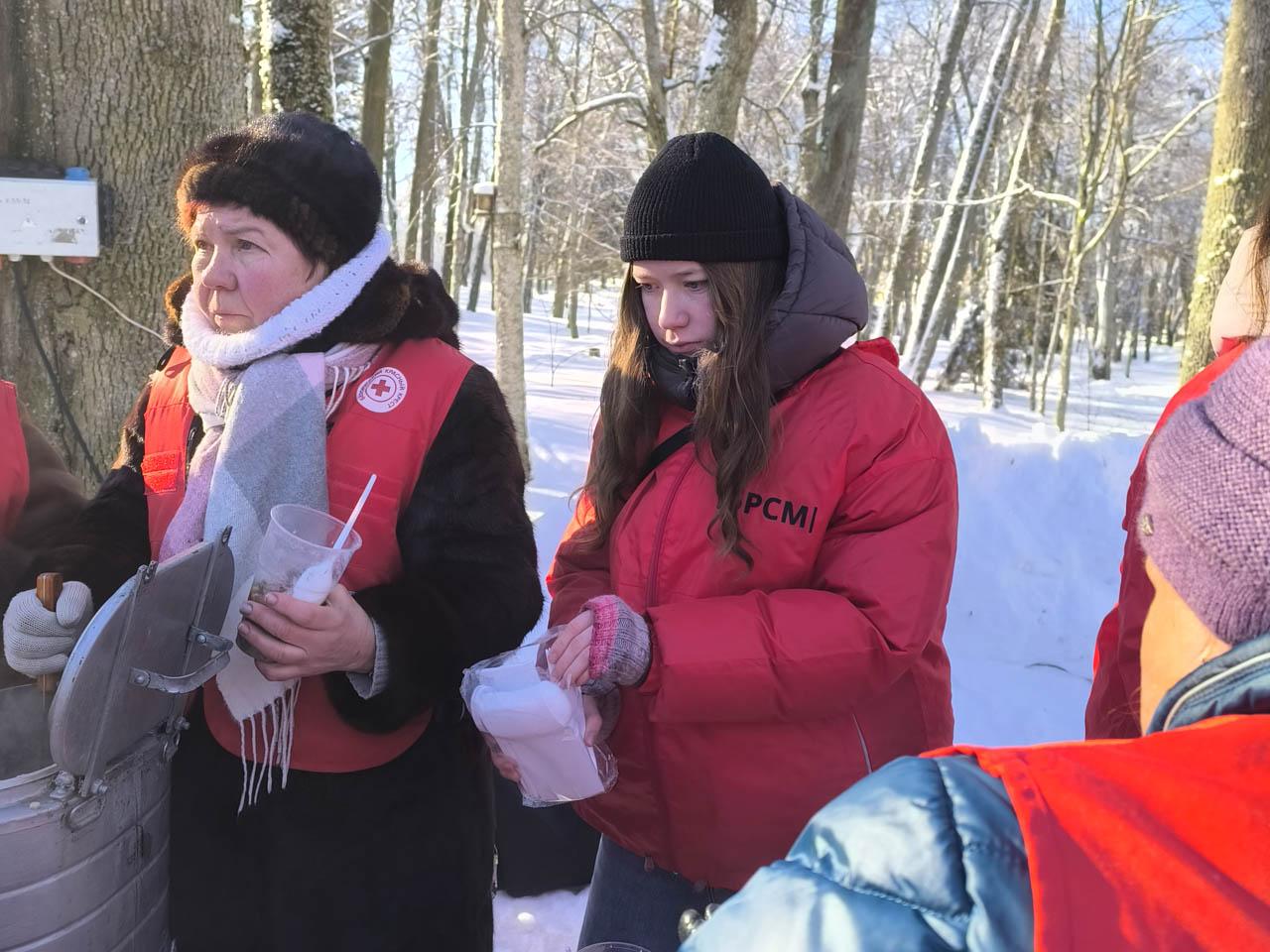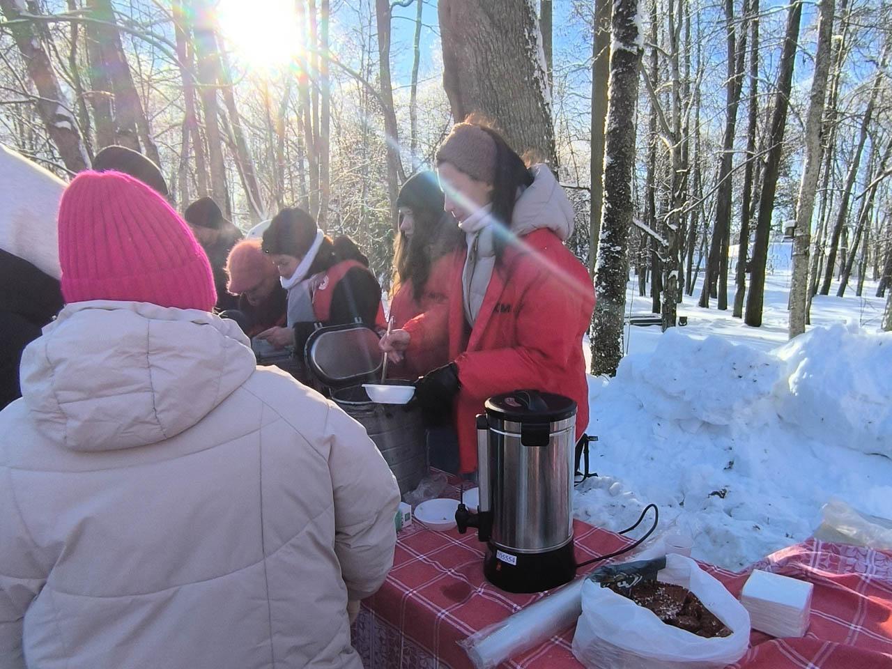 Во время всего мероприятия на территории работал фуд-корт, где можно было выпить горячего чаю, попробовать уху или кашу, а со сцены звучала веселая музыка от творческих коллективов района.