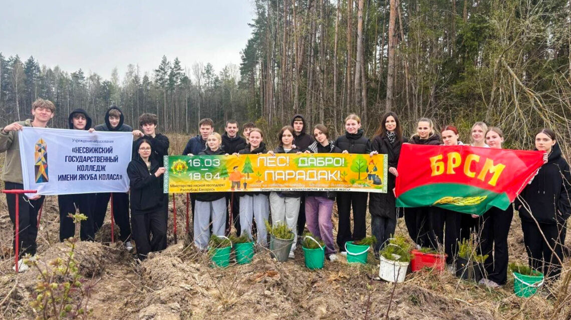 Студенты ГУ «Несвижский государственный колледж имени Якуба Коласа» высадили несколько сотен саженцев хвойных пород — елей и сосен — в урочище Галовцы.